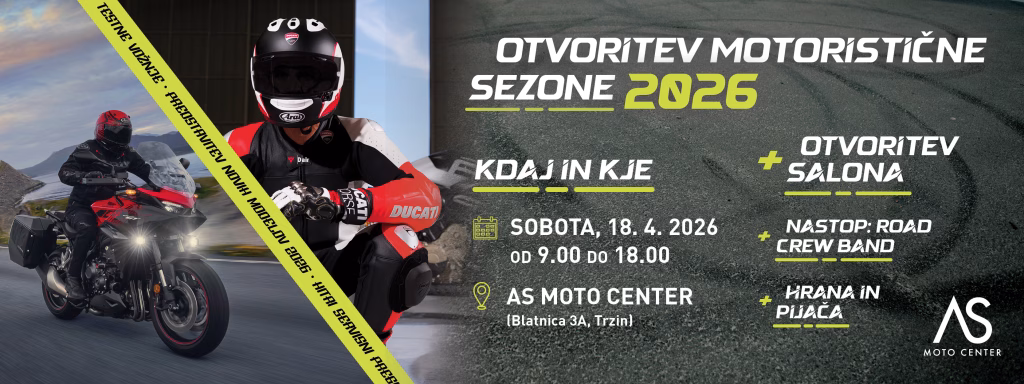 AS MOTO CENTER vabi na že tradicionalno OTVORITEV MOTORISTIČNE SEZONE in OTVORITEV PRENOVLJENEGA SALONA. Za obiskovalce bo v soboto, 18. 4. 2026 od 9.00 do 18.00 na Blatnici 3A v Trzinu veliko aktivnosti, ugodnosti, dobre zabave in nepozabnih nakupov.