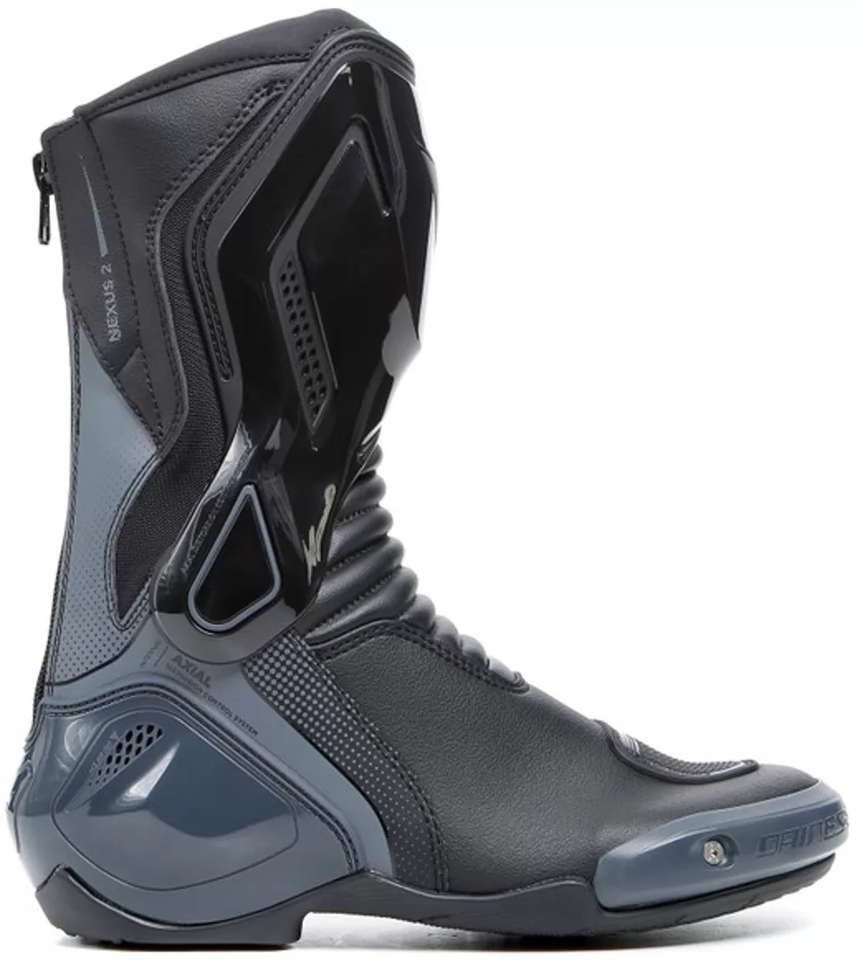 Dainese Nexus 2 so športni motoristični škornji s ščitniki, zasnovani posebej za ergonomijo ženskega stopala. Izdelane iz mikrovlaken in D-Stone z najlonskimi vložki na peti, so opremljene z izmenljivimi termoplastičnimi drsniki, Axial Distortion Control System, ki usmerja gleženj pri njegovem gibanju in najlonskimi zaščitnimi vložki na peti ter so popolna kombinacija visoke stopnje zaščite, maksimalnega udobja in lahkotnosti.