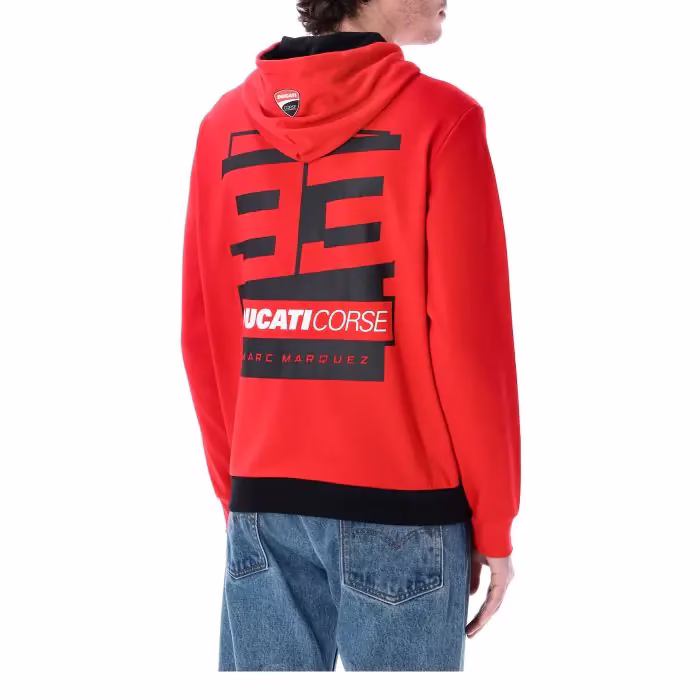 Ducati jopa s kapuco CORSE MM93 iz uradne kolekcije Ducati dual Marquez. Rdeča in črna podlaga z logotipoma voznika in moštva, natisnjenim spredaj in zadaj. Našitek Ducati na sprednji strani in zapiranje na zadrgo.