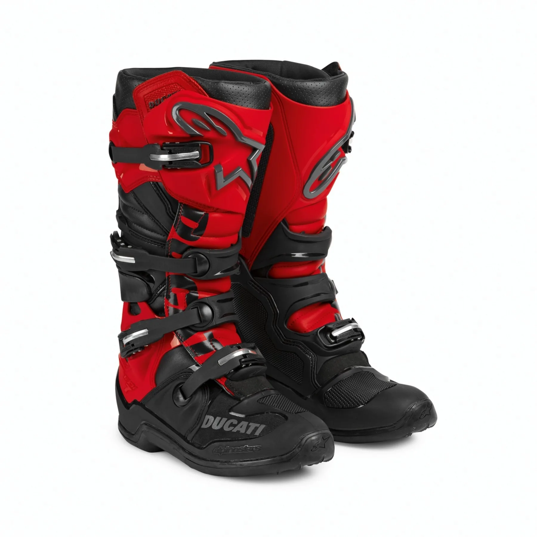 Motokros škornji Explorer T7, izdelani v sodelovanju z Alpinestars, so izjemno specializirani in zasnovani za uporabo v motokrosu. Certificirani v skladu z najnovejšimi standardi, so opremljeni s serijo togih ščitnikov na vseh področjih prtljažnika in stopala s strukturo, ki je zelo odporna na obrabo in udarce. Visoko športna usmeritev opozarja tudi na ergonomijo s prisotnostjo togega zunanjega podplata iz dveh komponent, integriranega v osnovno strukturo, ki izboljša vzdržljivost, oprijem stopalk in občutek. Nedrseča notranja podloga iz mikrovlaken ohranja nogo na mestu in zagotavlja dosledno prileganje tudi pri dolgotrajni uporabi. Medialna stranska plošča TPU je zasnovana tako, da omogoča oprijem kolesa in hkrati ščiti pred udarci. Vgrajena mehka pena okoli gležnja in narta zagotavlja neprimerljivo udobje, izboljša prileganje in absorpcijo v primeru udarca. Vsebuje tudi sistem zapiranja s 4 aluminijastimi zaponkami z visokim udarcem, s pomnilniškimi nastavitvami in sistemom za hitro sprostitev s samodejno poravnavo, za enostavno in natančno zapiranje ter izboljšano zmogljivost pri vožnji. Usedite se na svoje kolo in doživite ves adrenalin motociklističnega športa v popolni varnosti in udobju.
