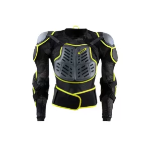 Prezračevana jakna z zaščito za prsni koš, hrbet, ramena in komolce, izdelana iz mehkega in raztegljivega blaga, nastavljiv pas z dvojnim ježkom.