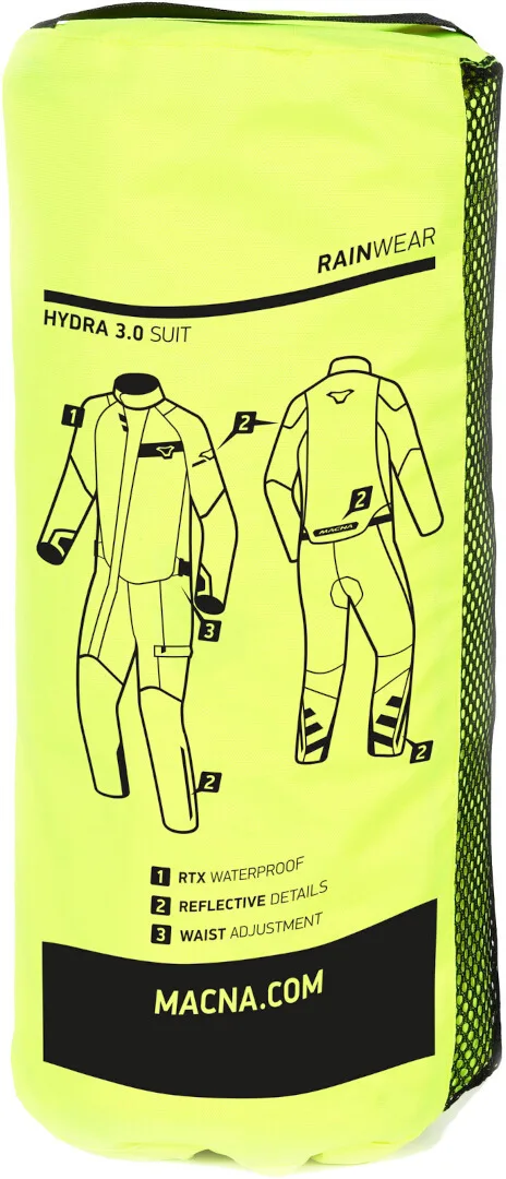 Pripravite se na nepredvidljivo vreme z motorističnim dežnim kombinezonom Hydra 3.0 znamke Macna. Z vodoodpornim materialom Raintex ste dobro opremljeni proti mokroti. Laminirani odsevni elementi na nadlahteh, križu in gležnjih poskrbijo, da boste opazni tudi v dneh z zmanjšano vidljivostjo. Za enostavno shranjevanje lahko obleko pospravite v priloženo potovalno torbico z odprtino za vodo.