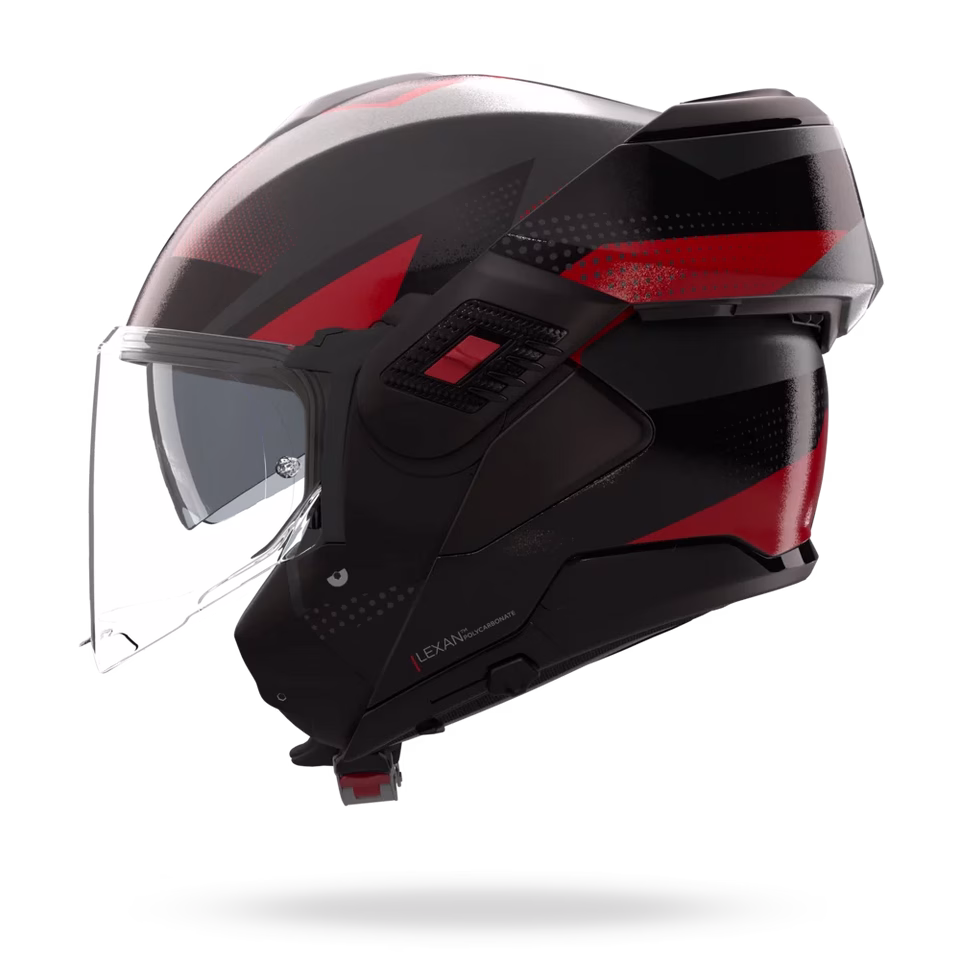 Zunanja školjka je izdelana iz vrhunskega Lexan™ polikarbonata, materiala, ki je znan po svoji izjemni odpornosti na udarce in vzdržljivosti v ekstremnih pogojih. Za dodatno varnost skrbi sistem Dual Action, ki preprečuje nenamerno odpiranje podbradnega dela, hkrati pa omogoča enostavno upravljanje z eno roko.