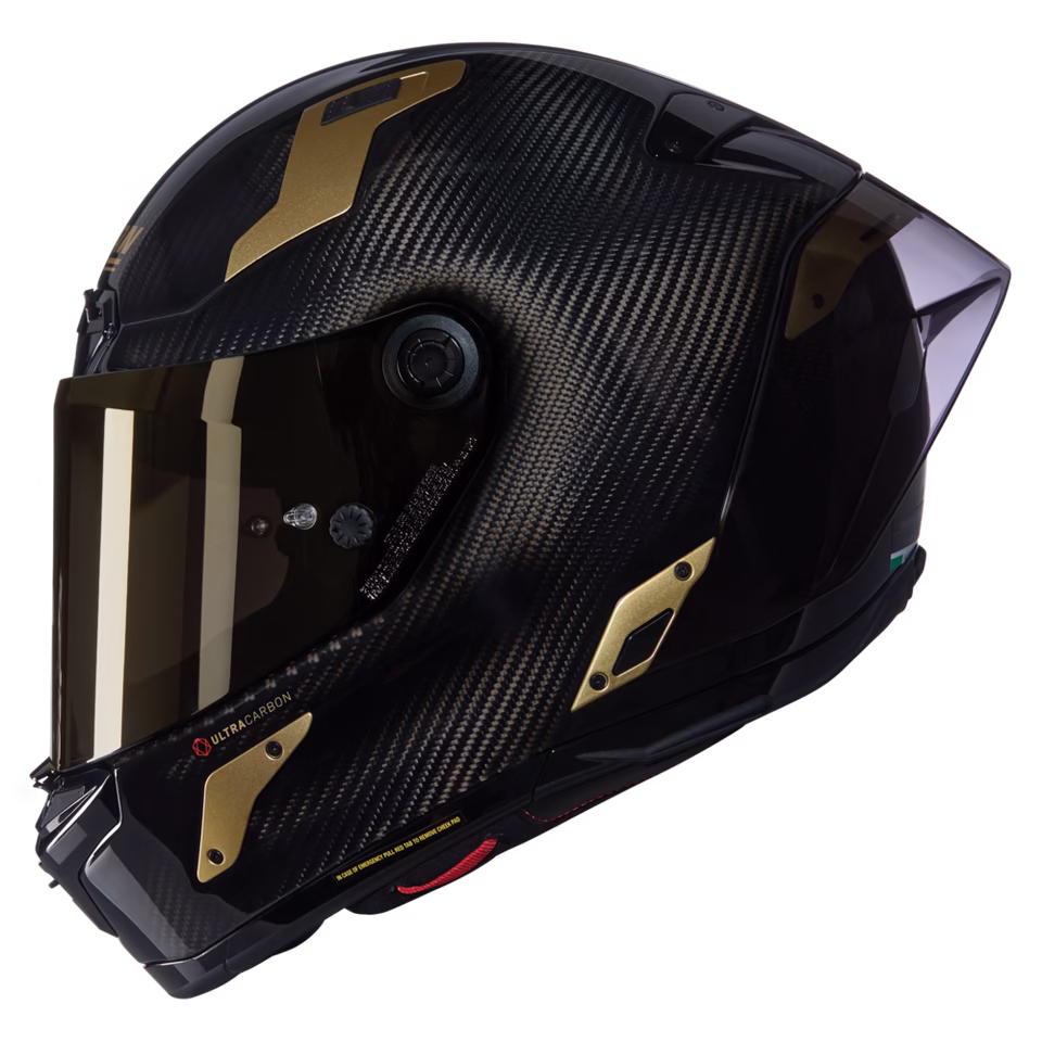 • Peresno lahka. Ročno izdelana zunanja školjka iz kompozitov. Zunanja školjka je ročno izdelana iz izbranega kompozita in z izjemno visokim deležem karbona. Razvoj in proizvodnja sta in ostajata italijanska. Štiri velikosti zunanje školjke za kar najbolj natančno prileganje glavi, ne glede na velikost voznika. Tako smo dosegli najnižjo težo ob sočasnem doseganju najvišjih standardov zaščite, najmanjši aerodinamični upor in zaradi idealno postavljenega težišča optimalno udobje.